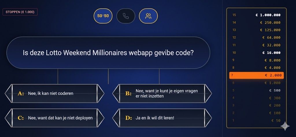 In video 5 les ik uit hoe je AI Studio (https://aistudio.google.com/apps) gebruikt om te vibe coden. AI Studio is op dit moment de beste gratis vibe code tool die er is. In de eerste 7 minuten van de video leg ik uit hoe dit werkt en geef ik wat praktische tips. Uiteindelijk hebben we een lotto weekend millionaires quiz gemaakt inclusief hulplijnen, feedback, professionele lay-out en geluidjes. En het mooie is: Dit template is makkelijk herbruikbaar zodat elke docent er zelf 15 vragen in kan zetten!
